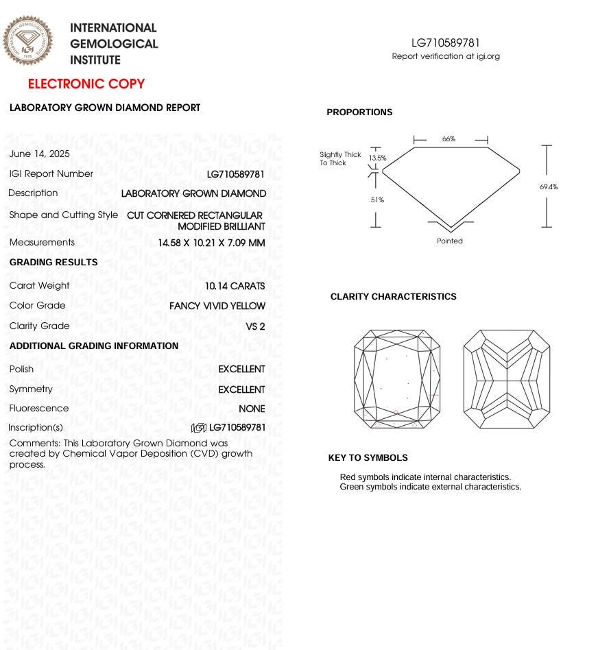 10.14 CT Yellow Radiant Cut Lab Grown Diamond | IGI Certified | Best Diamond for Engagement Ring