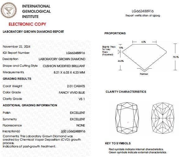 2 CT Cushion Cut Vivid Blue Lab Grown Diamond For Engagement Ring