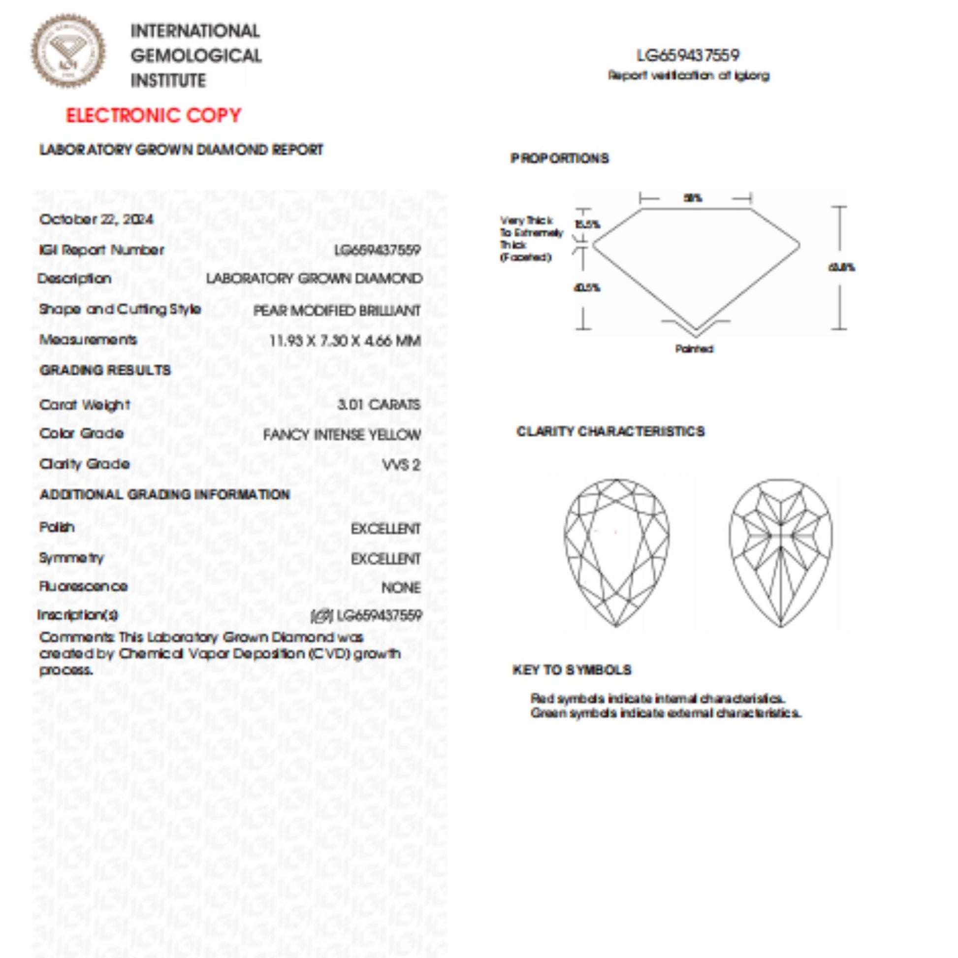 3 CT Pear Intense Yellow Lab Grown Diamond For Engagement Ring