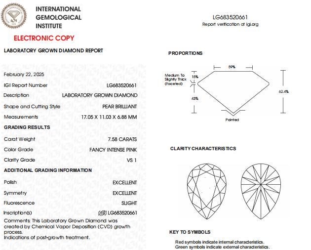 7.58 CT Pear Intense pink Lab Grown Diamond For Engagement Solitaire Ring