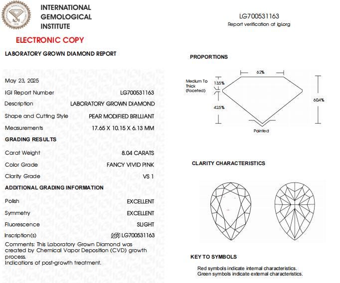 8 CT Pear Vivid Pink Lab Grown Diamond For Engagement Ring