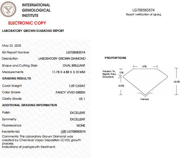 Unique 1 CT Green long Oval Shape Lab Grown Diamond for Engagement Ring or Anniversary Gift | IGI Certified